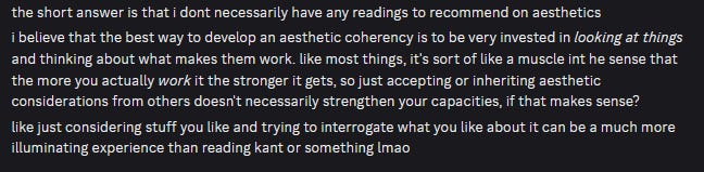 This is sort of a smarter way of saying what I said above, in the sense that the point I’m trying to make here is that “just accepting or inheriting aesthetic considerations from others doesn’t ncessarily strengthen [one’s own] capacities.” This is why I always find it hard to accept that when I make a negative or positive statement about something people try to insist I’m stating a quantifiable fact rather than just stating my own subjective engagement with it.